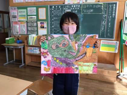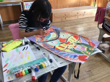 色の塗り方を工夫したり、細かいところまで描き込んだりして、物語から想像した様子や感じたことを表していました。