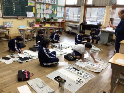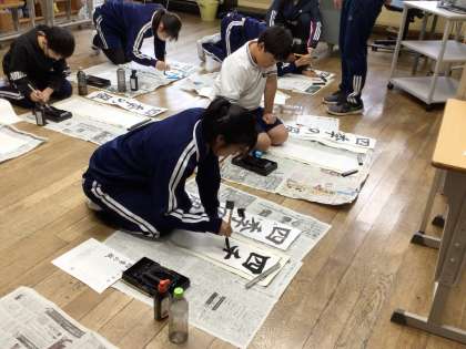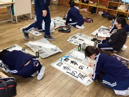 最初に、筆の運び方や文字のバランスなど、書く時に気をつけることを確認していました。