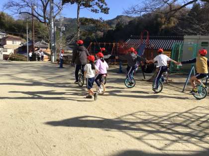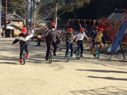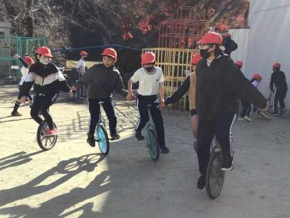 なんと、いろいろな学年が入り乱れて一輪車に乗っていました。
