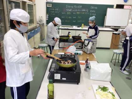これまでに習った「ゆでる」「いためる」といった調理技術を使って、おかず作りの調理実習をしました。