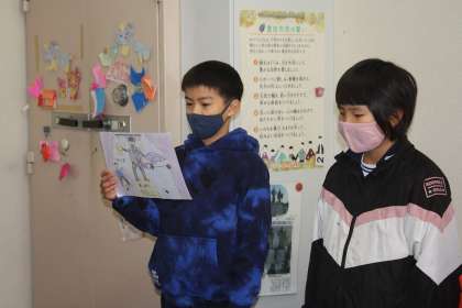 朝活の時間に、4年生が校長室で社会科の授業のまとめを発表してくれました。