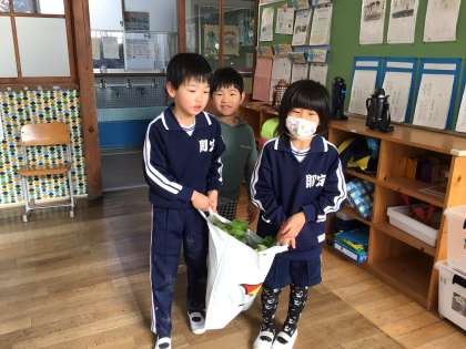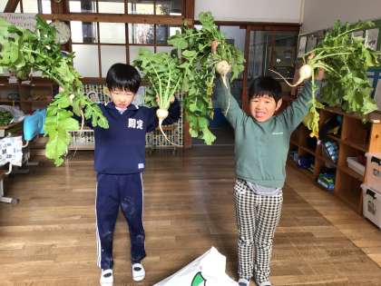 ダイコンを両手に持って、ダイコンお化けに変身した1年生です。