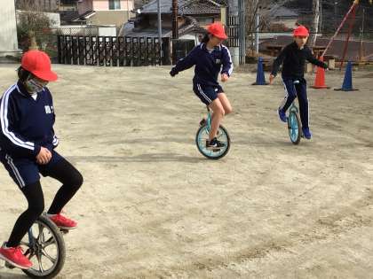一輪車に乗る中学年。