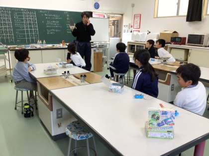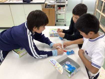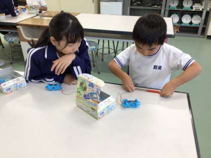 3年生 理科「電気の通り道」 公開日 2024/01/19 更新日 2024/01/19 各学年から 豆電球に明かりがつくかどうかを利用して、電気を通すもの・通さないものを実験で調べていました。 最後に調べたものは磁石。 実験を繰り返すうちに、導線の位置によって明かりがつく時とつかない時があることが分かりました。 明かりがついた時とつかなかった時の違いを考えていたら、磁石の塗料の有無に気がつきました。 物には、電気を通すものと通さないものがあることが分かりました。