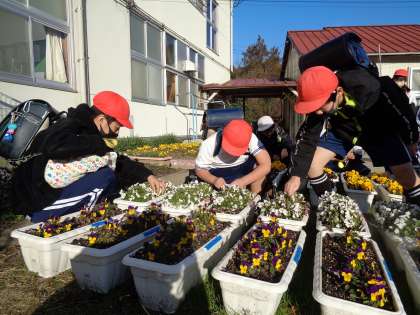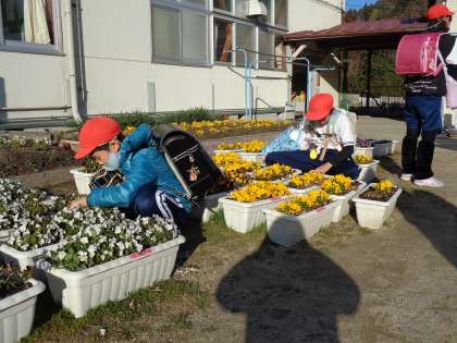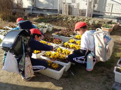 下校前に、自分のビオラの状態を見て、花がらを摘んでいる子どもたちがいます。