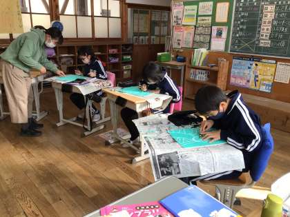 刀先の形状によって彫りの印象が変わることを確認した後、安全に気をつけて彫り進めていました。