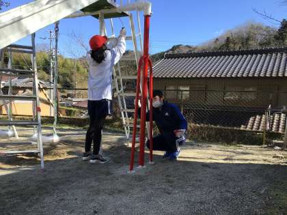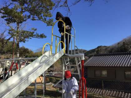 今日は、ブランコや滑り台のペンキ塗りをしました。