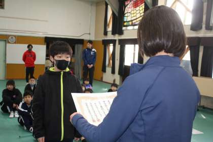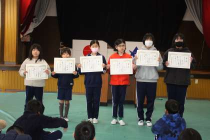 集会後半では、読書感想画や作文で、優秀な成績を収めた児童の表彰伝達を行いました。