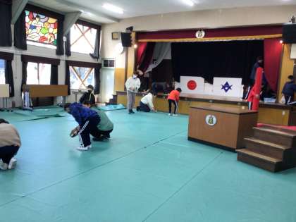 仮に敷いていたシートを整え、卒業生用の赤絨毯の一部を設置しました。