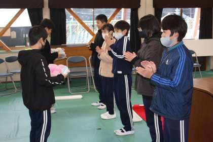 予行練習の前に、6年生から学校へ雑巾のプレゼントがありました。