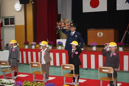お巡りさんに黄色い帽子をかぶせてもらい、お家の人にかっこよく敬礼しました。