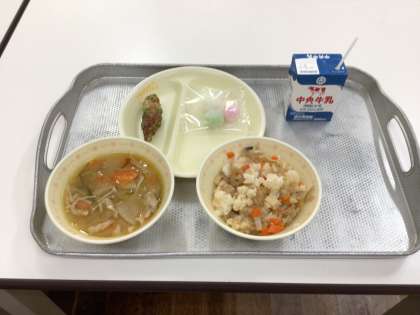 今日の給食のメニューは、ちらし寿司、大根の味噌汁、ちくわの磯辺揚げ、花見団子でした。