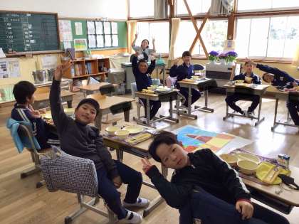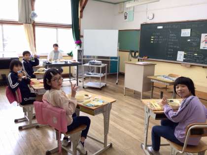 5年教室では、窓から見える桜を愛でながら、おいしそうに給食をいただいている姿がありました。