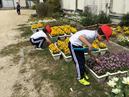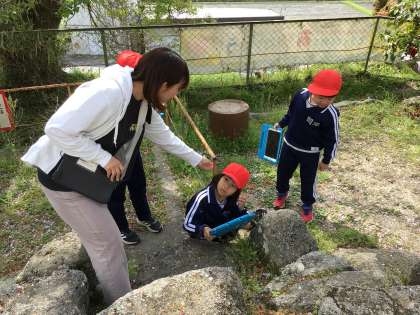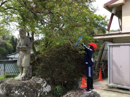 校庭や運動場で春を見つけては、学習用タブレットで写真を撮っていました。