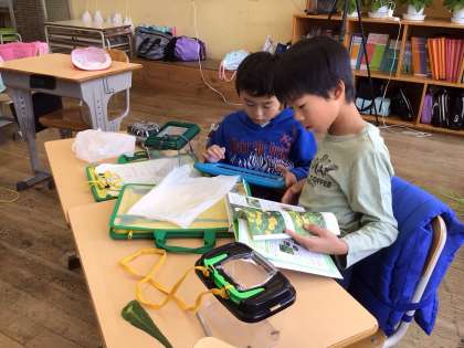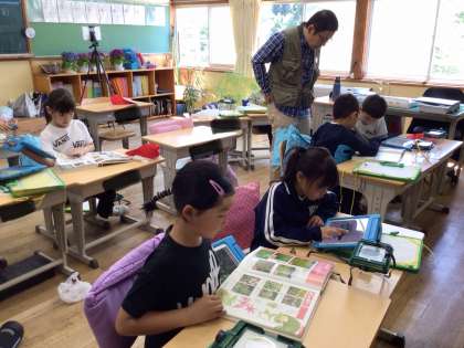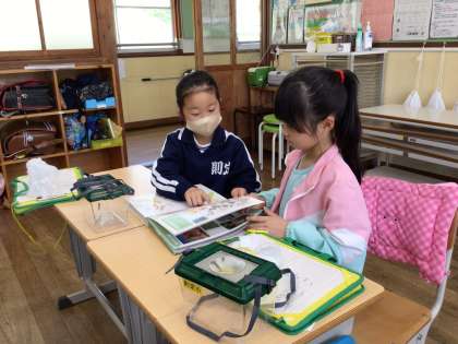 屋外での観察の後は、教室で植物の名前や特徴を図鑑で調べました。