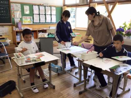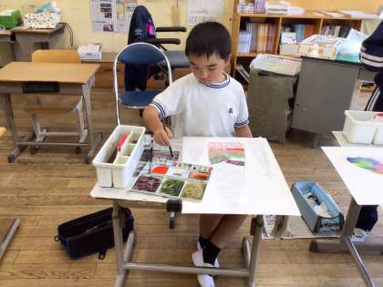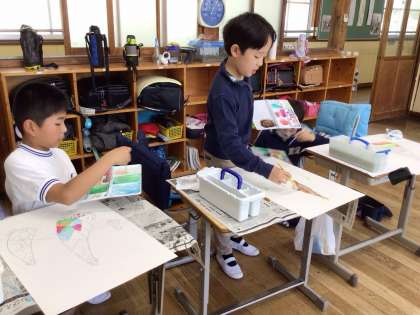 前回の図工の時間に描いた輪郭に色をつけていました。