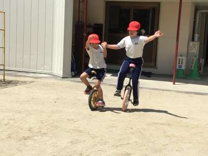 「校長先生、見てー」の声に校庭を見てみると、一輪車に乗る女子2人。