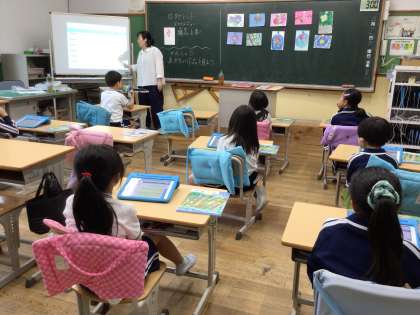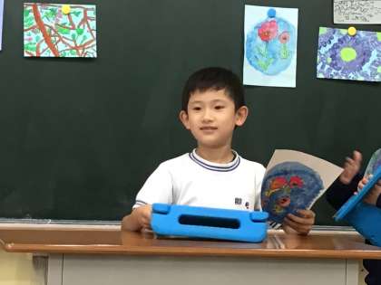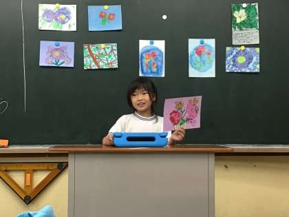 学習用タブレットで作品カードを作り、お互いの作品を見合いました。