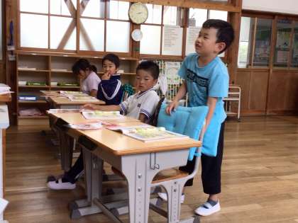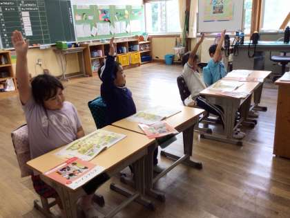教科書の絵を見て、よいことやよくないことをしている動物を見つけて発表していました。