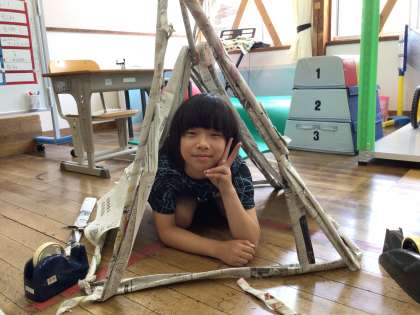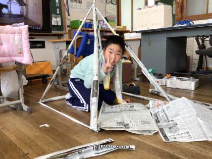 新聞紙を丸めて筒状にしたものを柱にして、家をつくっていました。