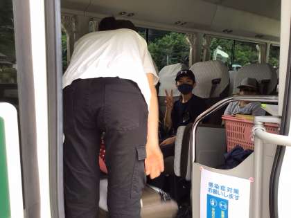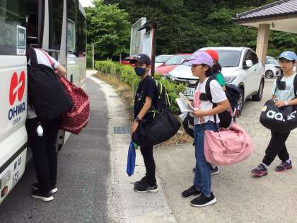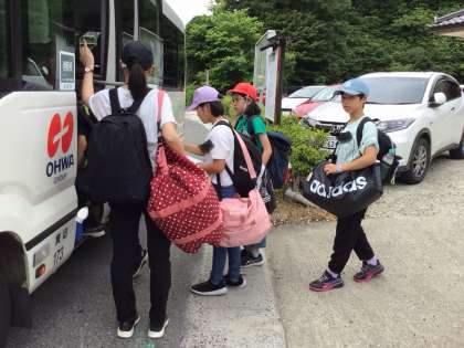 冷田小、佐切小の友達が乗っているバスに乗り込みました。