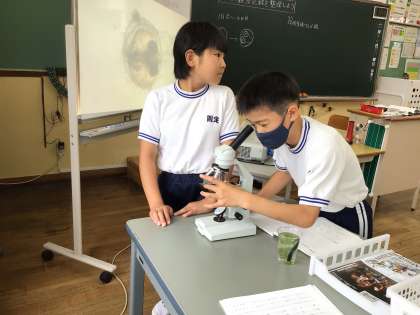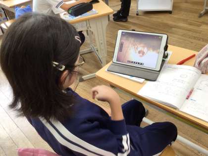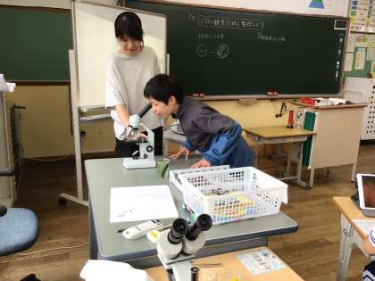 顕微鏡をのぞいたり、タブレットで撮影した顕微鏡写真を拡大して見たり、たまごの変化を工夫して調べていました。