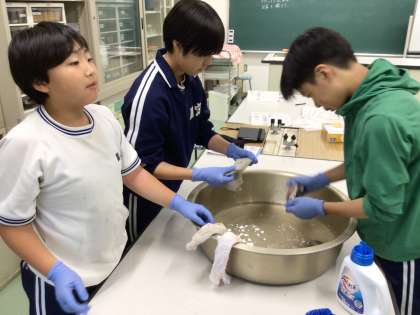 洗濯の仕方を調べ、手順に従って手洗いをしていました。