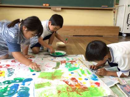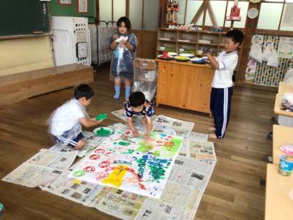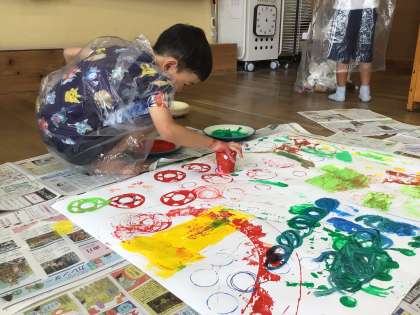 絵の具の色や写す形や材料を自由に選び、体全体を使って楽しんで取り組んでいました。