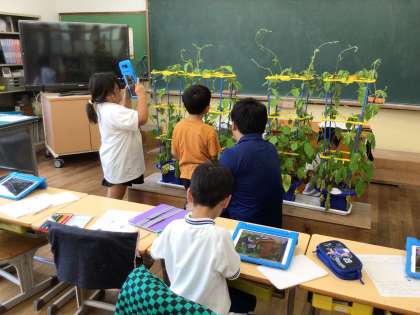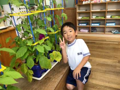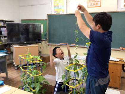 自分の背よりも高く成長したアサガオに、喜びいっぱいの1年生です。