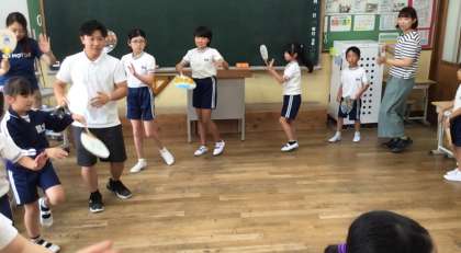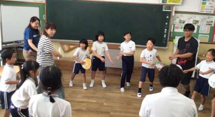 昨日のクラブ活動で、踊りの先生から盆踊りを習った文化クラブの子どもたちが中心となって、休み時間に「盆踊り練習会」を開いていました。
