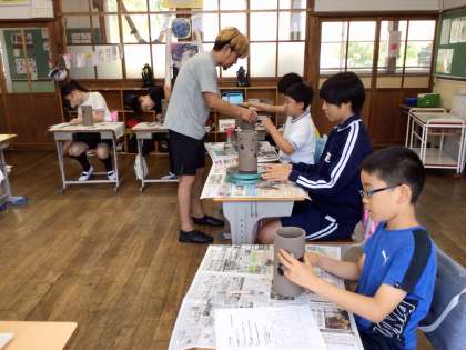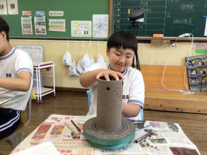 筒状の粘土を、型抜きしたり、模様をつけたりして、作り上げました。