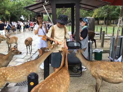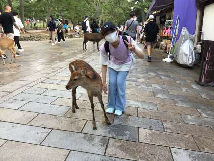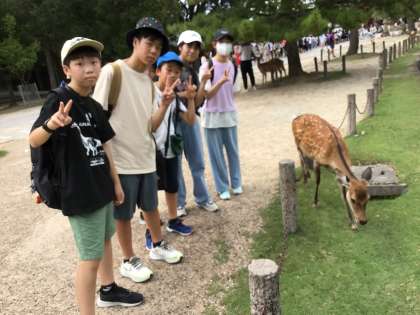 修学旅行 鹿大好き 公開日 2024/09/12 更新日 2024/09/12 学校行事 奈良公園の鹿に大興奮。 鹿せんべいを買ったものの、一瞬で食べられてしまうハプニングもありました。 散策途中で雨がぱらついたものの、子どもたちも鹿も元気です。