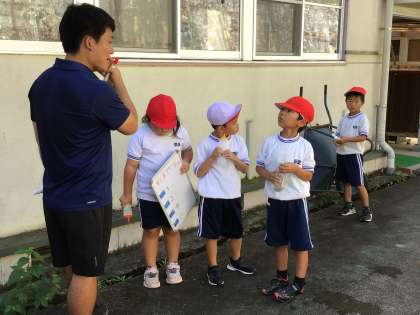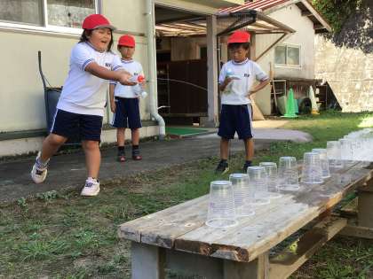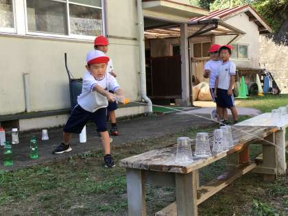 水鉄砲を使ったゲームを考えて、みんなで遊んでいました。