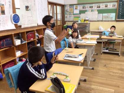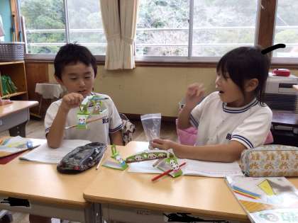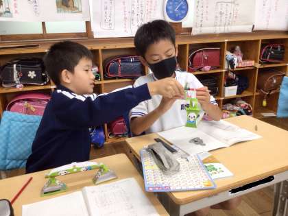 てんびんを使って、鉛筆や定規の重さを測っていました。