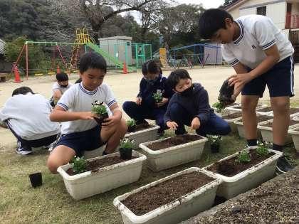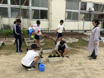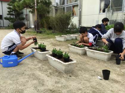 5年生が準備してくれたプランターに、早速、ビオラの苗を植えました。