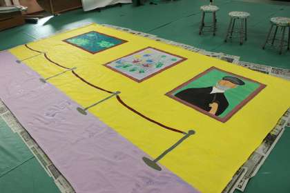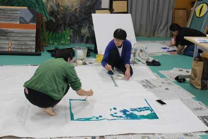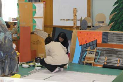 にもかかわらず、窓を開け放した集会室で、ボランティアの皆さんが背景画を描いてくださいました。