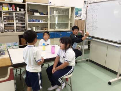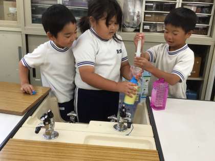 3種類の容器を使って、水を入れたり、他方に移し替えたりして、どの容器が一番かさが大きいか調べていました。