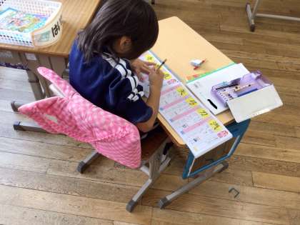 先生と一緒に空書きをした後、ドリルに丁寧に練習をしていました。