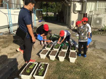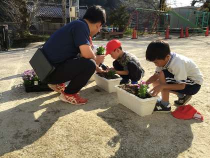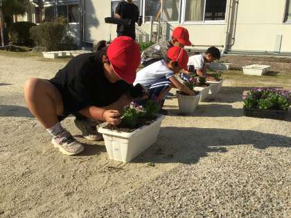 3年生の後を追うように、1年生も苗を植えるために校庭に出てきました。