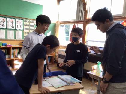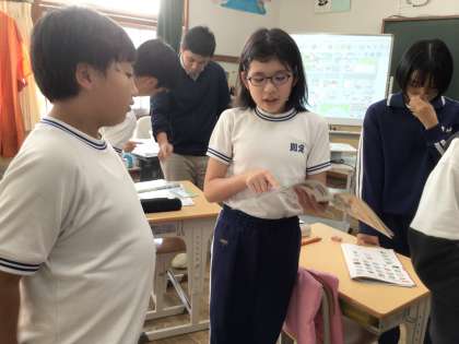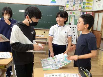 これまでに習った、道を案内する表現を使って、6年生に道案内をしていました。