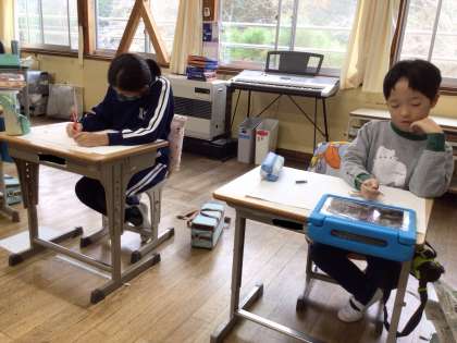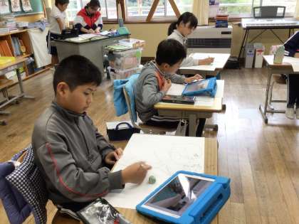前回、アイデアスケッチに取り組んでいた読書感想画の下絵書きと色塗りをしていました。
