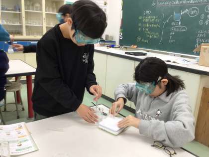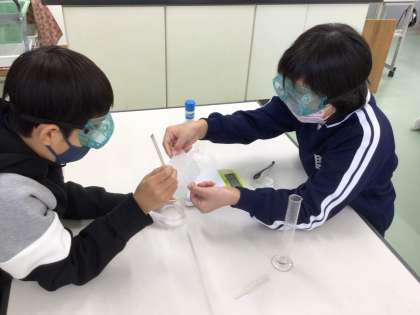 実験器具の名前や扱い方を確認した後、早速、食塩を5gずつ溶かしていました。