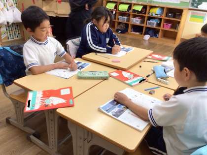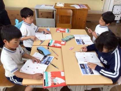 助詞の「は」「へ」「を」の使い方を、みんなで確認していました。