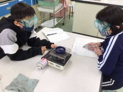 今日は、水溶液に溶けているものを取り出すために、蒸発皿に取り分けた水溶液を下から熱していました。