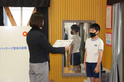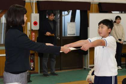 図書館を使った調べる・伝える学習コンクールで学級賞を受賞した4年生と、赤い羽根児童作品コンクール書道の部で優秀な成績を収めた児童の表彰を行いました。