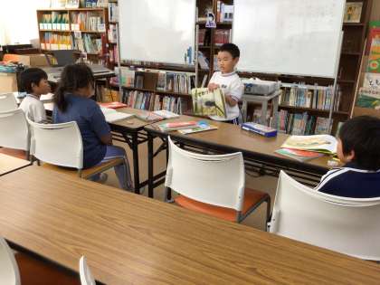 全校集会で好きな教科を発表した経験を生かして、好きな理由も加えて話していました。