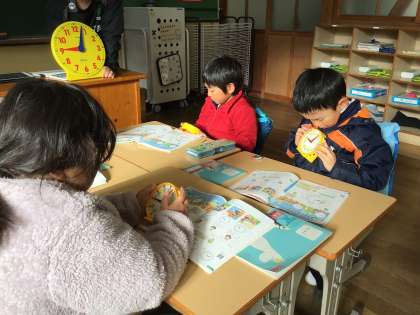時計を使って、何時何分を読む練習をしていました。
