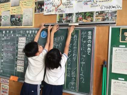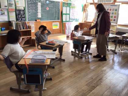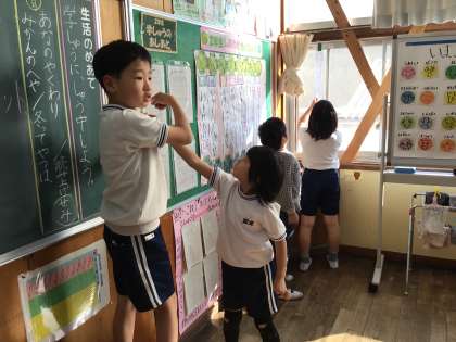 教室にある100センチの物を見つけようと、ペアで物差しを持って測っていました。