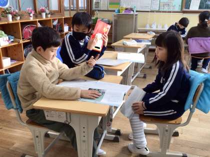 登場人物の気持ちが、出来事の前後で変わったのか、変わらなかったのか、自分なりの解釈を伝え合っていました。