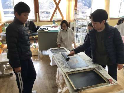 彫刻刀で彫った版を刷っていました。